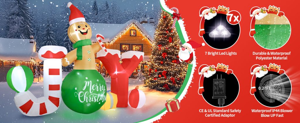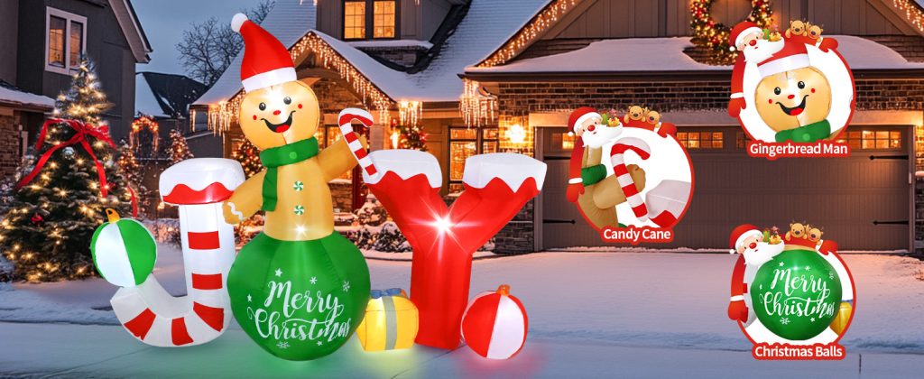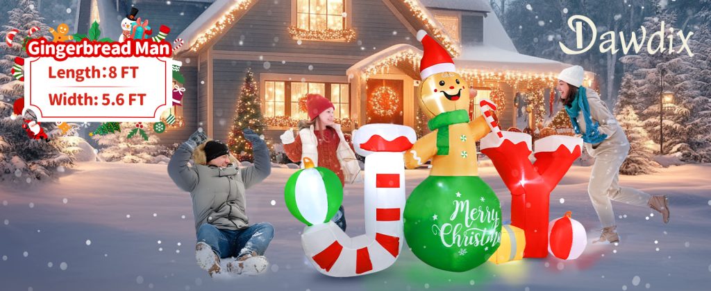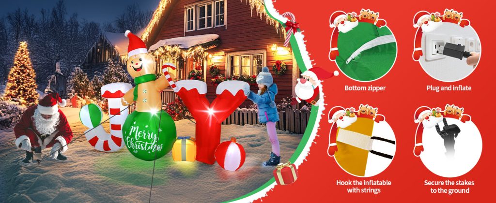 - 6 X 8FT GINGERBREAD MAN CHRISTMAS INFLATABLE OUTDOOR DECORATION: This gingerbread man is in shape of “JOY” and is paired with classic Christmas elements like Christmas ball ornaments, hat and candy canes to create a festive atmosphere. It’s perfect for decorating homes, yards, malls, or storefront.