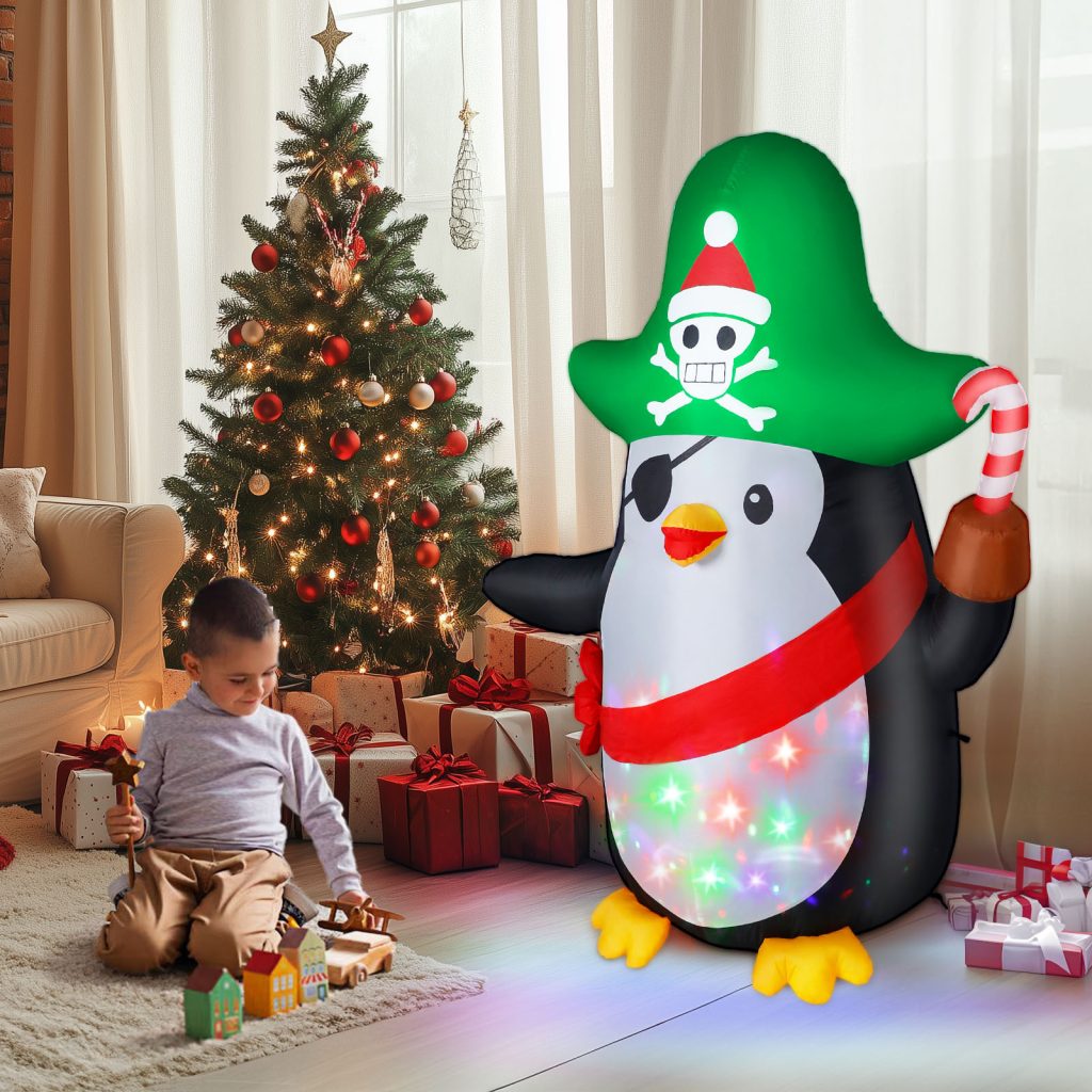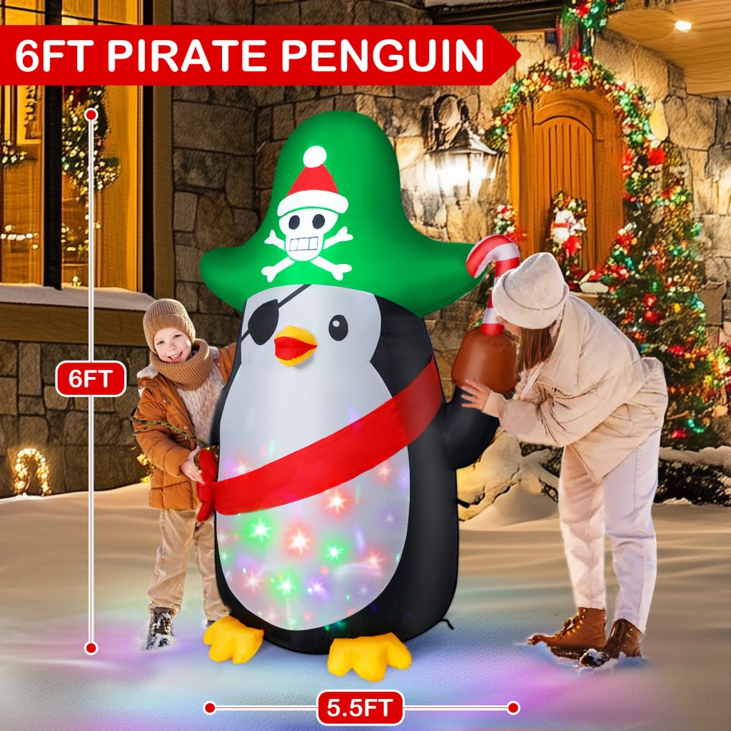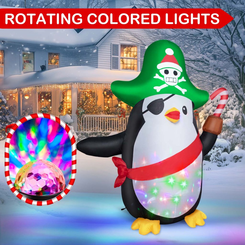 • 6FT PIRATE PENGUIN CHRISTMAS DECORATIONS OUTDOOR : Add a fun twist to your christmas décor with this 6ft Pirate Penguin Inflatable ! Dressed in a green pirate hat and eyepatch, this adorable penguin brings holiday cheer with a playful pirate theme. Equipped with rotating colorful LED lights, it will stand out in your yard day and night.